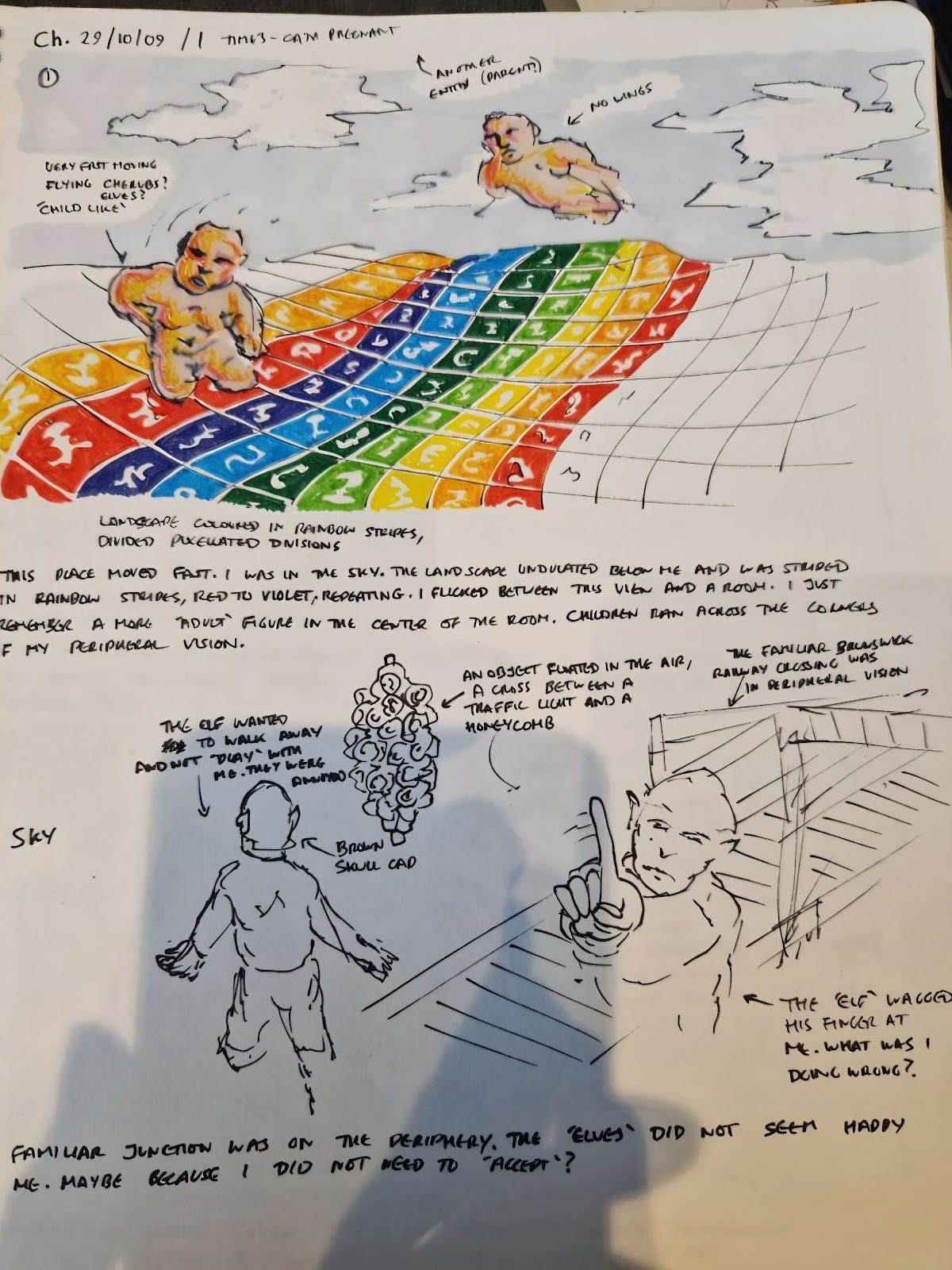 Then I realized I was flying in the blue sky high above a mountainous landscape striped in the colours of the rainbow. Each colour extended into the horizon and was bordered by a thin sharp white line, and divided into squares. On each square was a symbol so the whole landscape was wallpapered in text. Entities flew towards me which resembled children, babies or cherubs, although I did not see their wings or faces (a common theme for me) and they did not speak or interact with me. Rather they were just curious about me. Somewhere within the sky there was a ‘boss’ entity but my memory cannot recall its appearance. I soared across the prismatic landscape in joy.