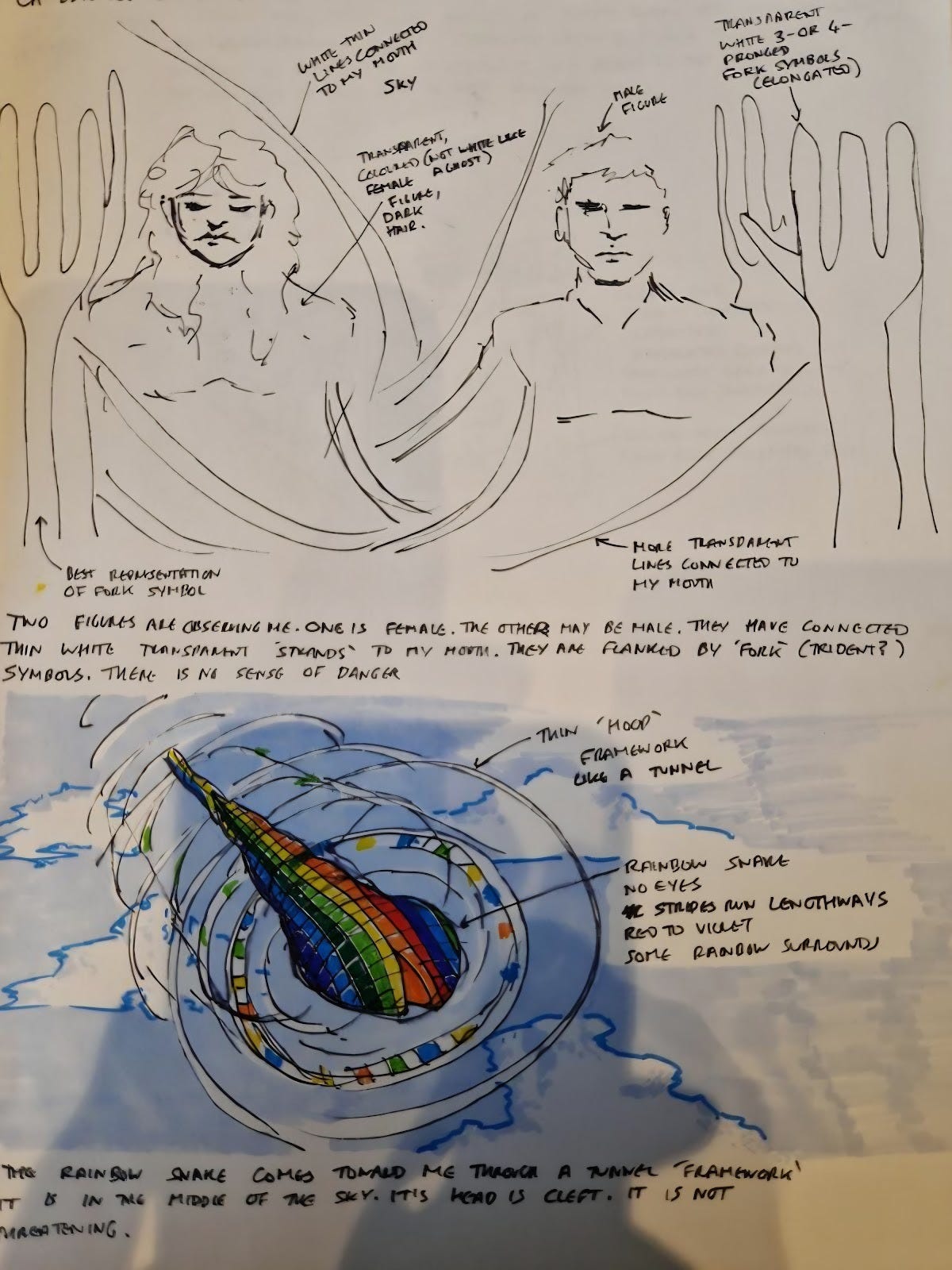 “This description accompanies the set of images which starts with a cherub flying in the sky and ends with a rainbow serpent heading towards me. The text was written by me in 2010 and was featured as only one of the 60 quality experience reports on DMT-Nexus.