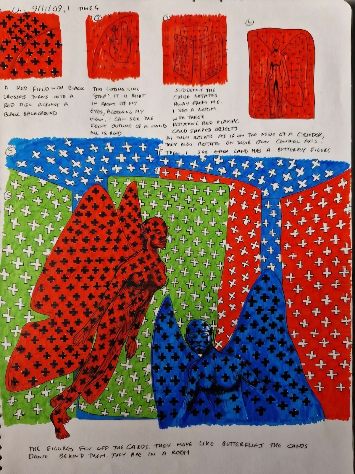The UK based Visionary Artist Matt Wilson shares with us an exclusive look into his personal field notes about DMT with in depth commentary. Matt’s brilliant visionary artwork has captured my imagination for years, as his representations of the hyperdimensional spaces are especially potent representations of the archetypal energies of DMT entities. Matt’s field work shared here is particularly interesting as he has been able to capture a compelling representation of the 4 color theory as well as the archetypal qualities of entity contact.