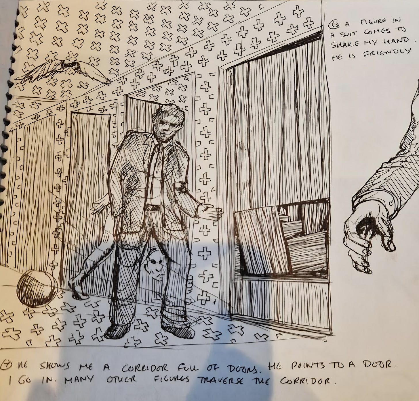I moved to a long corridor of doors, also tiled with crosslets. A human male figure in a suit beckoned me towards a door to try to get me to enter. In the distance I could see doors opening and closing, and figures going in and out and peeping round. When I tried to enter the door, I noticed it was actually made of many tiny doors, almost in a Fibonacci spiral, which got ever smaller towards the corner. The figure reached out to shake my hand.